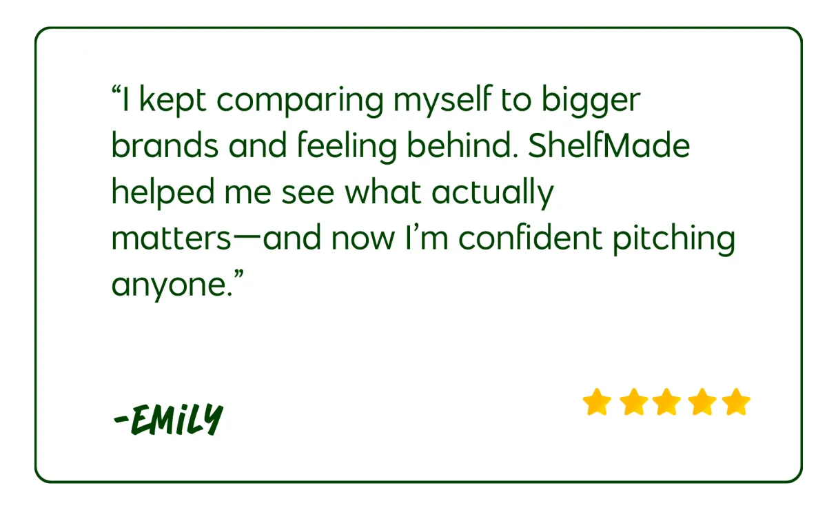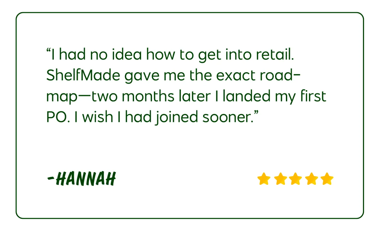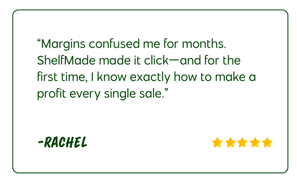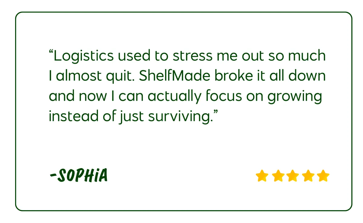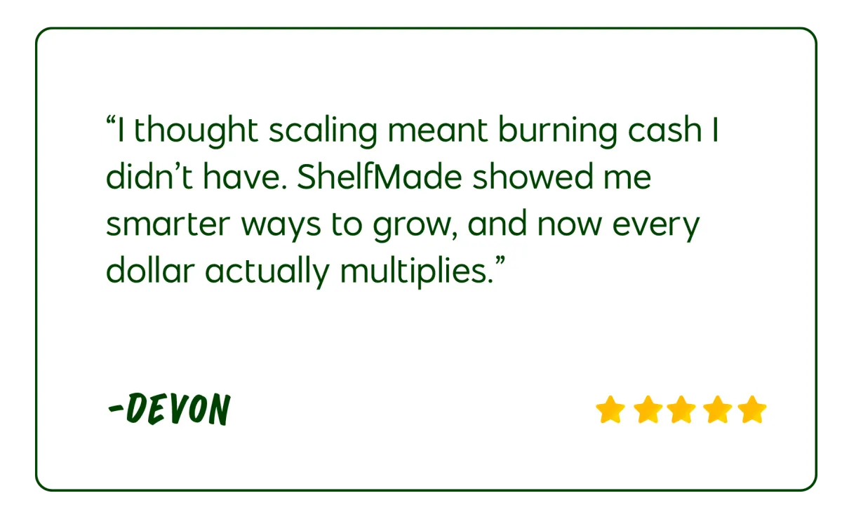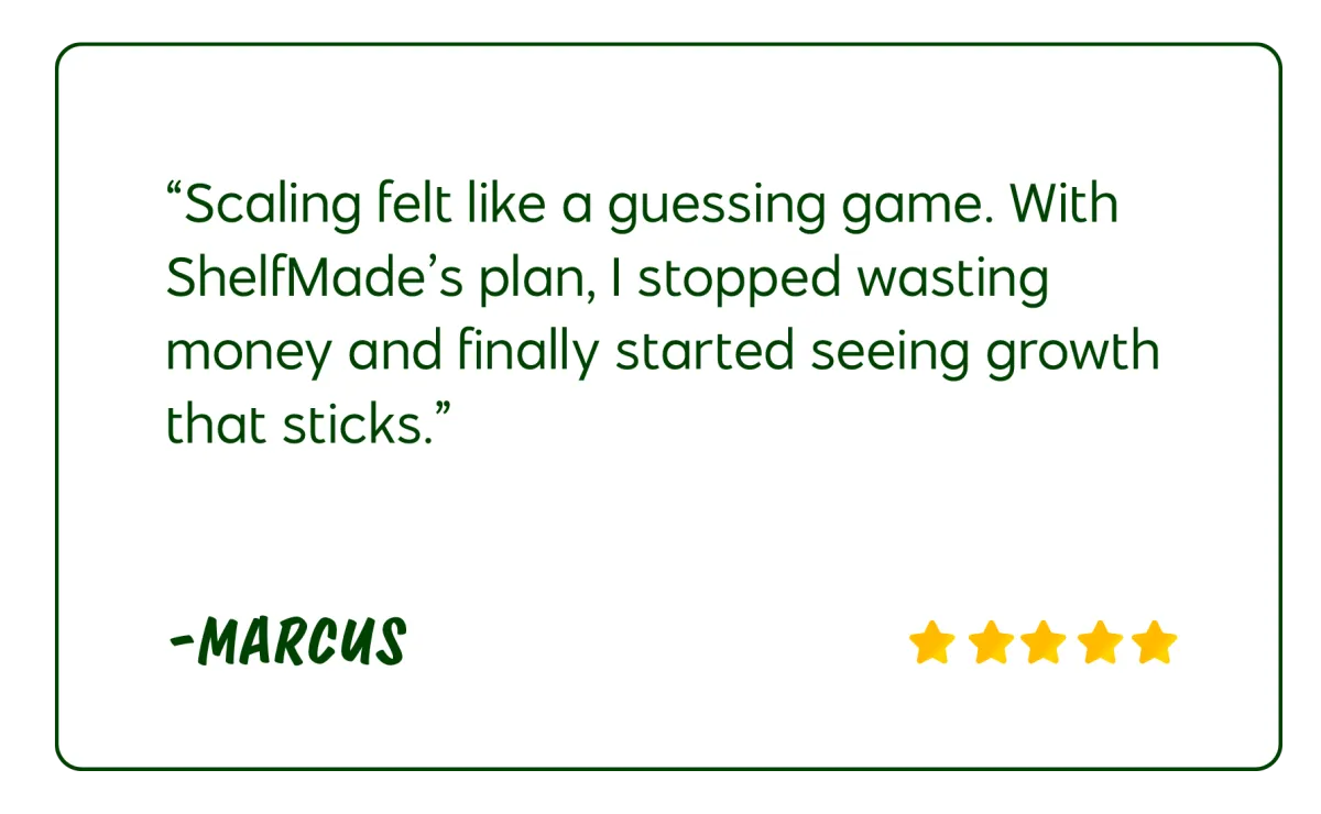 DISCLAIMER: The business results stated and shown are ShelfMade's results and the results of our clients. Results will vary depending on starting point, goals, effort, financial conditions, and system adherence. The testimonials featured have used one or many of the ShelfMade programs or services to achieve their results. Program and service lengths vary depending on needs and goals. The contents on our website are for informational purposes only, and are not intended to replace the advice of a financial or business professional, or provide any financial or investment advice.